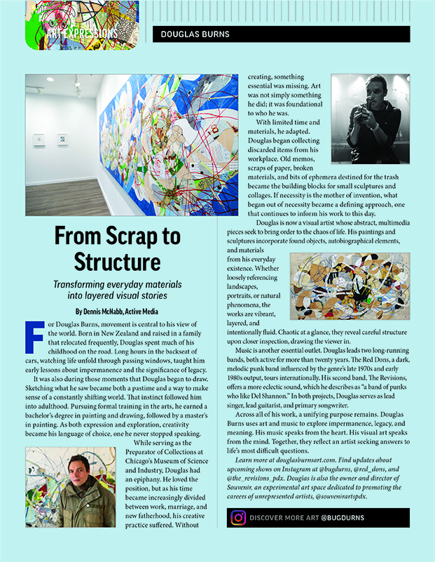 Douglas Burns is a multidisciplinary artist and musician born in New Zealand and raised in Louisiana and Oregon. His work is informed by a childhood spent largely in the backseat of his family’s station wagon, sketching scenes outside of the window. Now with children of his own, he continues to mine this experience, using daily ephemera as source material for collages, assemblages, and videos.